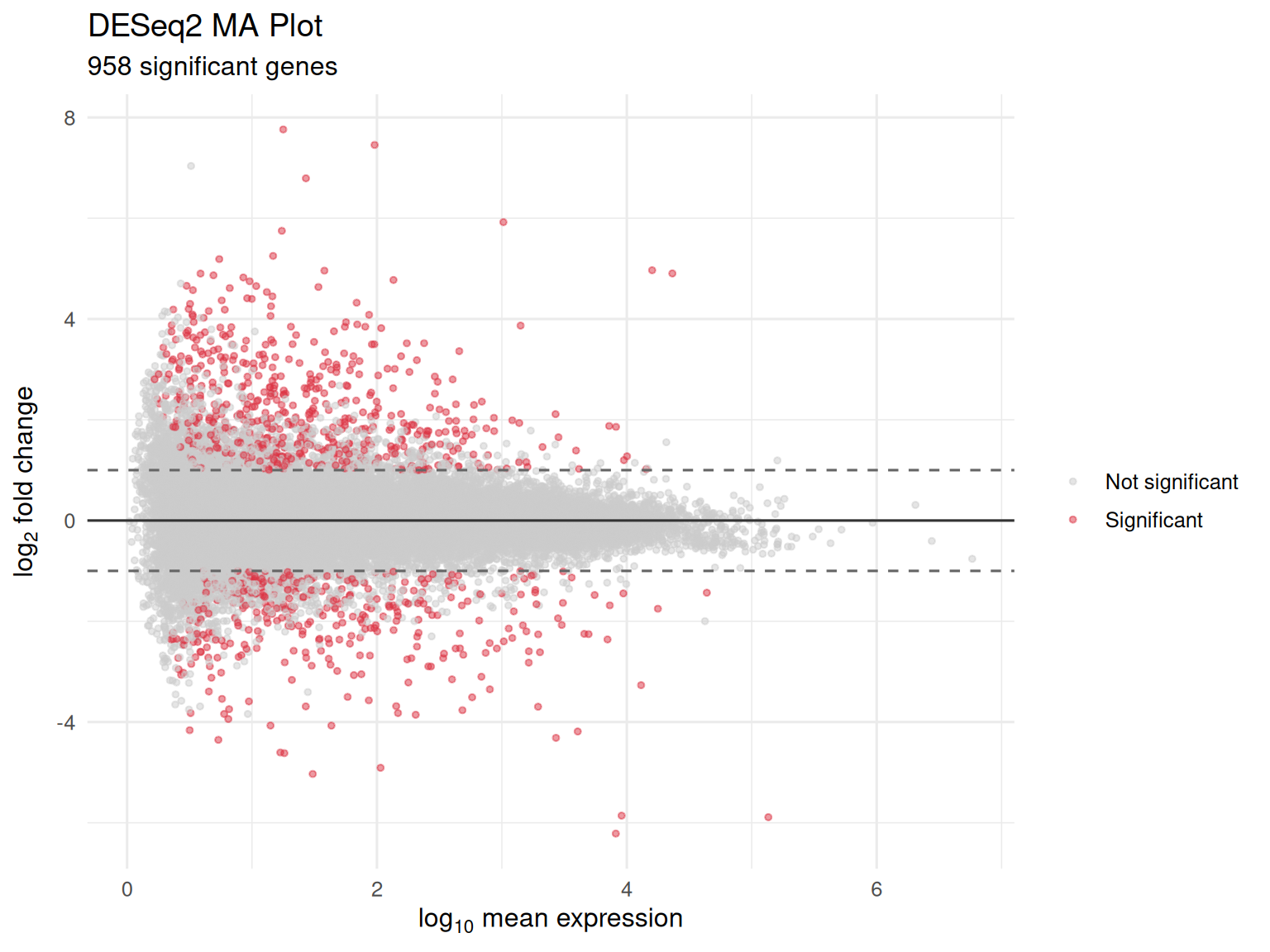 - Bland-Altman plot: mean expression (x-axis) vs fold change (y-axis)