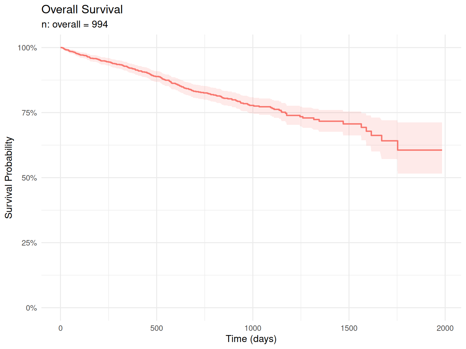 - Cure models: If a plateau is observed in KM curves, consider mixture cure models.