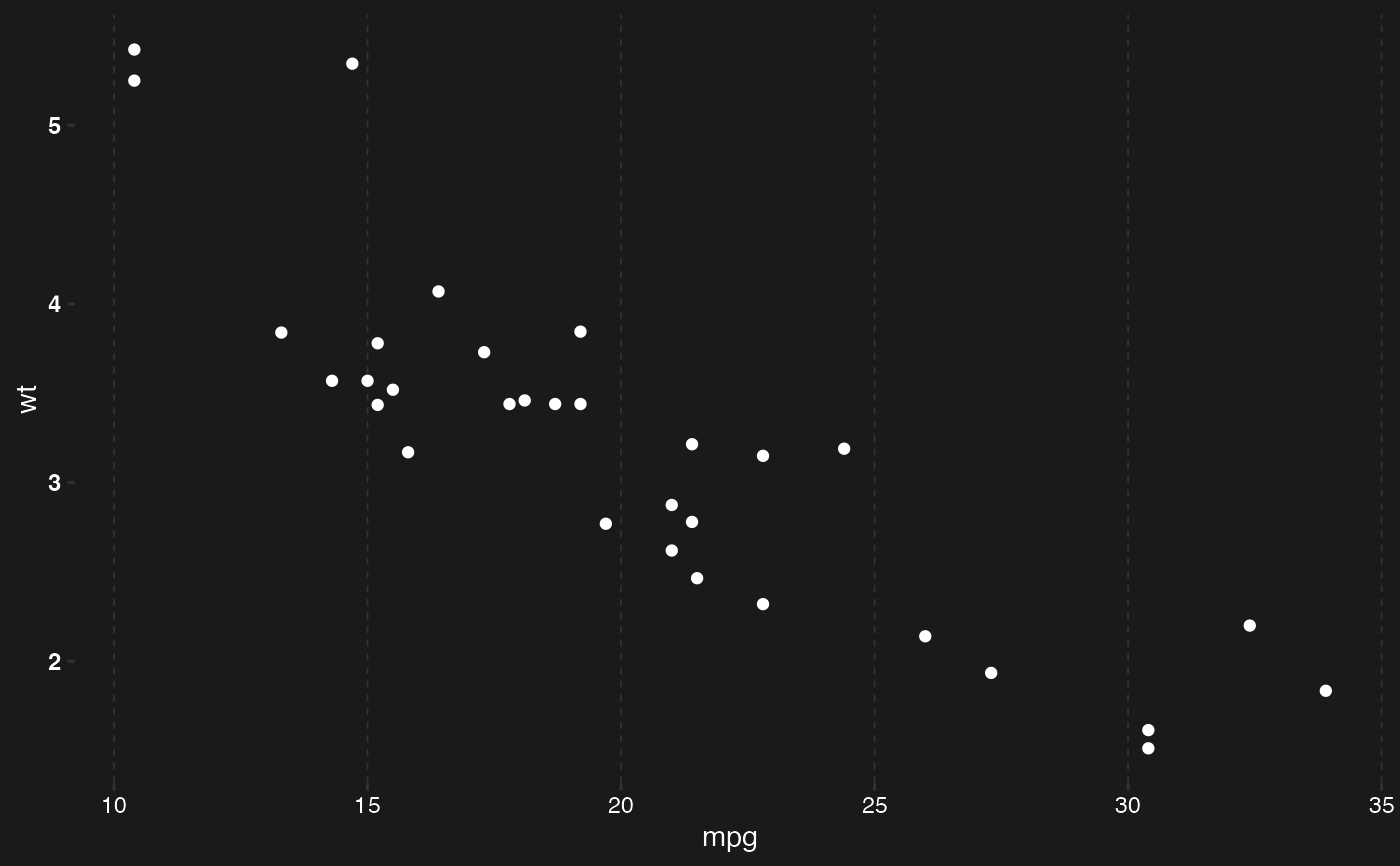 ggplot(mtcars, aes(mpg, wt)) + geom_point(color = "white") + theme_micromort_dark()