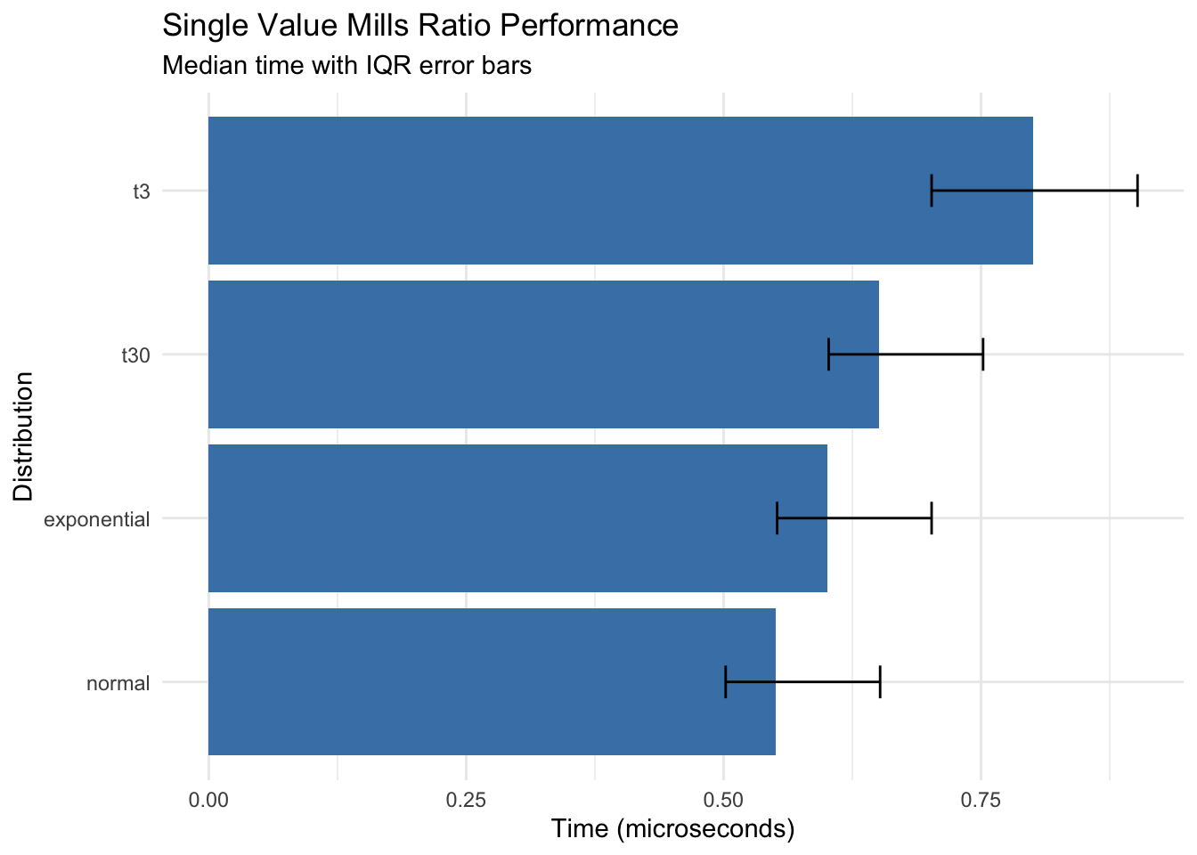 Key findings: - All distributions compute in sub-microsecond time for single values - Normal distribution is fastest (~0.55 μs) - t-distribution with low df is slowest but still fast (~0.80 μs)