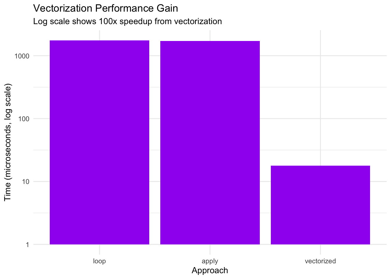 cat("Apply vs Vectorized:", round(times[3] / times[1], 1), "x slower\n")