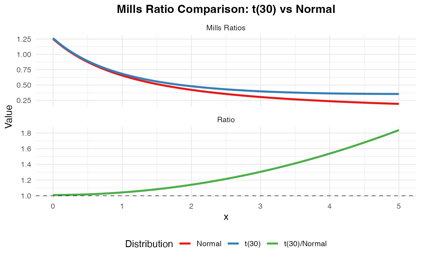 plot_mills_comparison(c(0, 5), "t", "normal", df1 = 30)